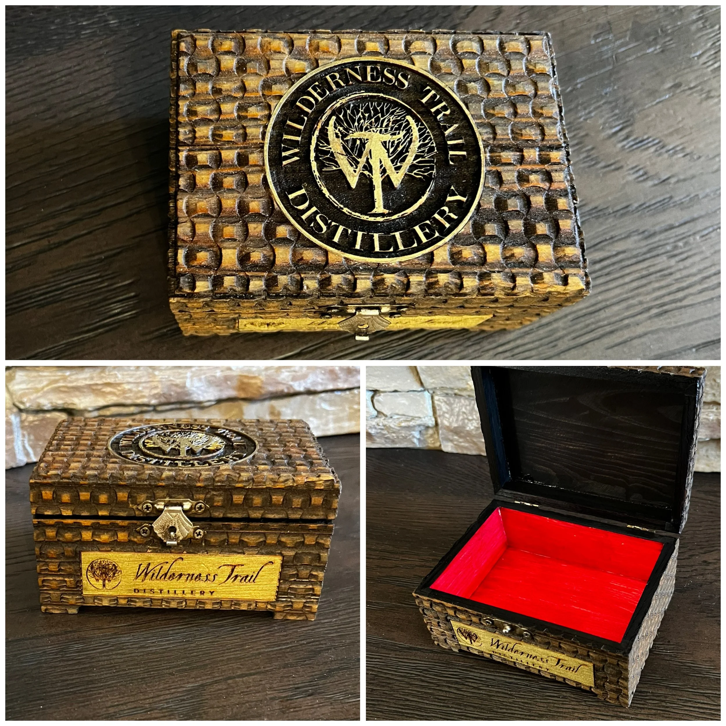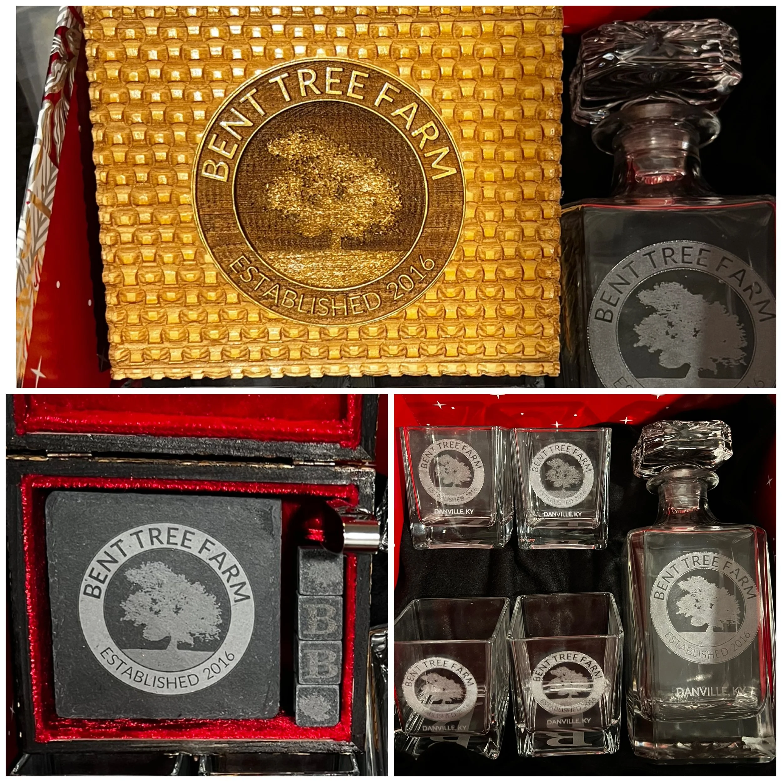 Laser Engraved Wood Box Lined with Logo, and Slate Coasters, Whiskey Glasses